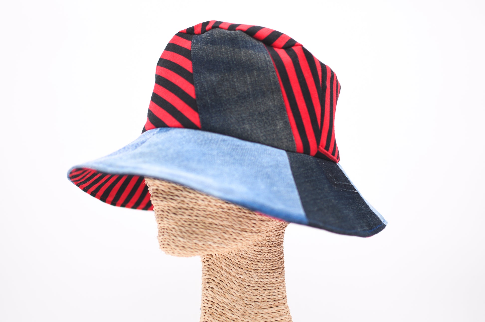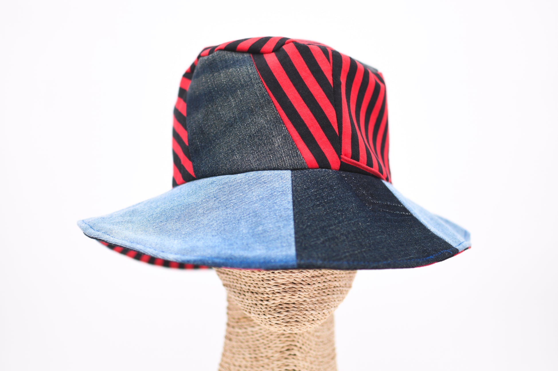 1 Of 1 Handmade Black Red Stripes And Denim Patchwork Bucket Hat